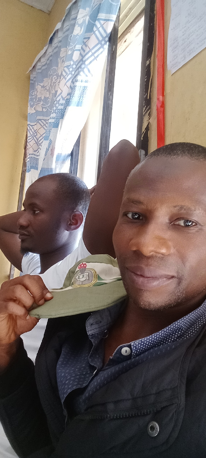 The scene is an interior room in Iyara, Nigeria. Two adult males are present. The subject in the foreground, a dark-complexioned male, faces the camera with a slight smile. He wears a dark blue patterned collared shirt under a darker solid outer garment and holds an olive-green National Youth Service Corps (NYSC) cap with a red and green emblem in his right hand. Behind him and to his left, a second dark-complexioned male, with a short beard, is seated in a relaxed posture, looking to his left, with his right hand behind his head. He wears a white t-shirt. The background consists of a yellow-painted wall, a window or doorway with a dark frame emitting bright light, and a light-blue curtain with white floral and geometric patterns. A piece of white paper with handwritten text and a vertical red strip are affixed to the wall on the right.