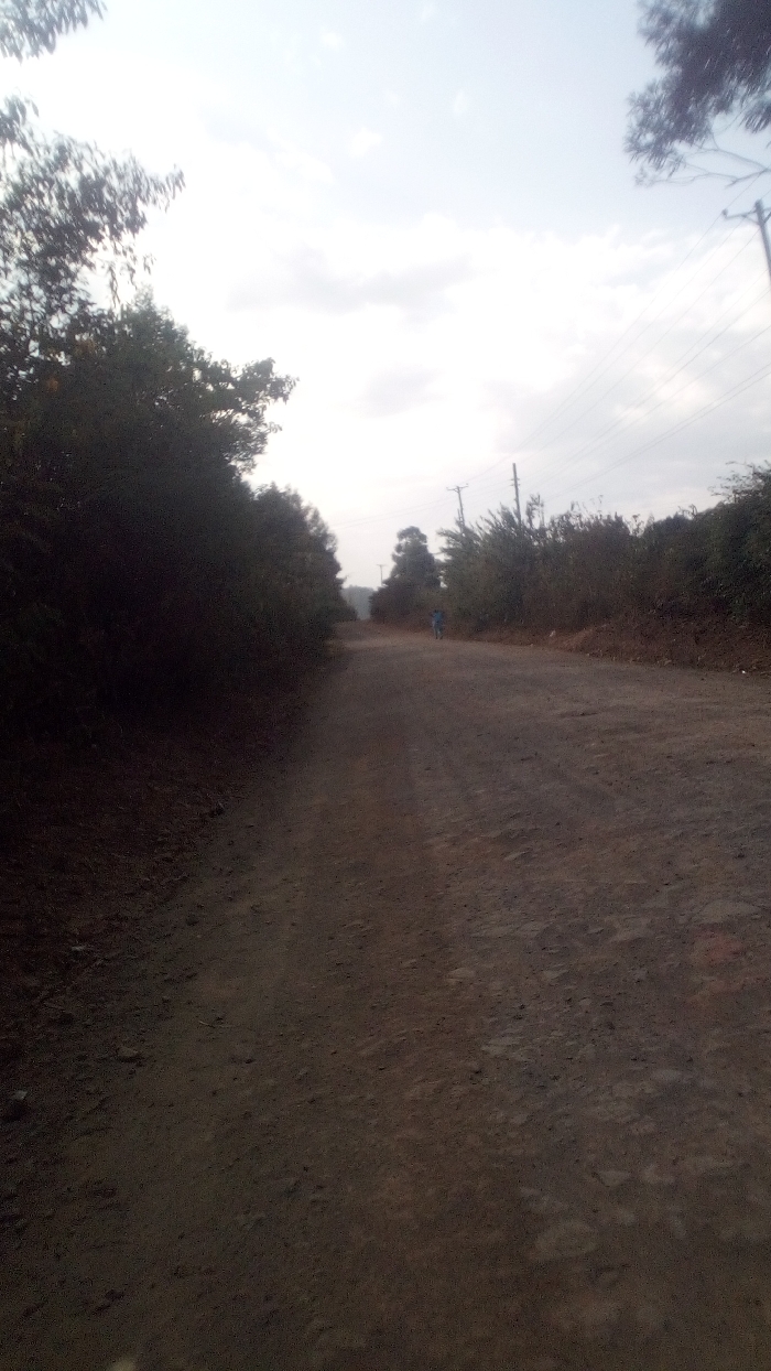 A dirt road stretches into the distance, bordered by dense trees and shrubbery on both sides. Overhead, a pale sky with scattered clouds suggests either dawn or dusk. A distant figure walks along the road, providing a sense of scale to the scene. Utility poles and wires are visible in the background, hinting at the presence of infrastructure. The road surface is uneven, showing signs of wear.
