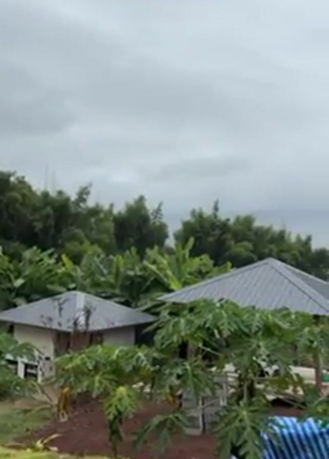 rural landscape under a cloudy sky. Two small buildings with grey roofs are visible in the foreground, surrounded by papaya trees and other lush vegetation. Behind the buildings, there is a dense area of bamboo and banana trees. A blue tarp is partially covering something near one of the buildings. As the camera pans to the right, it reveals a larger grassy area with a pile of sand. In the distance, mountains are visible through a light rain or mist. A fence runs along the property line, and a white building can be seen further away. The overall impression is of a quiet, agricultural setting on a gloomy day.