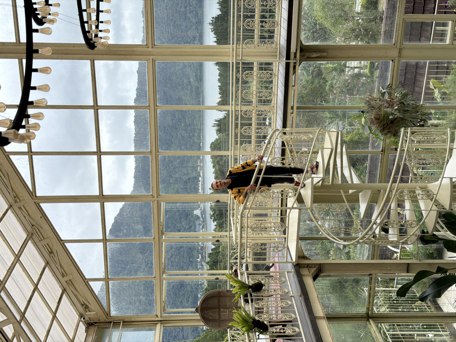 A rotated, high-angle shot inside a sunlit structure with a man on a spiral staircase. He wears a yellow and black jacket, black pants, and colorful shoes. The structure has large glass windows with a landscape view featuring a lake, mountains, and lush greenery. A chandelier is visible at the top left. Plants are situated on the lower floors of the staircase.