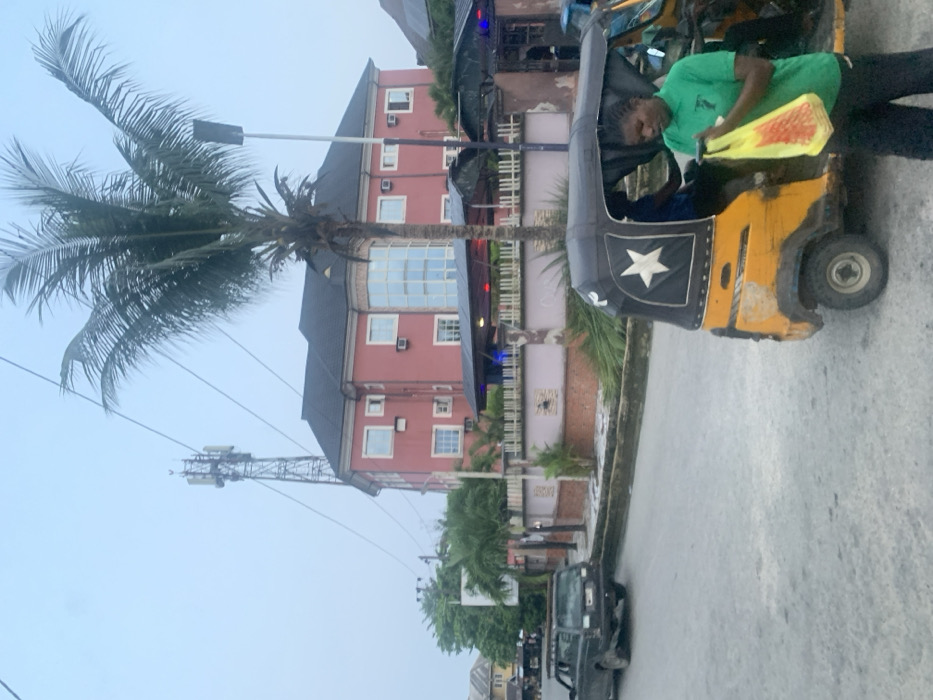 A three-wheeled vehicle, painted yellow and black with a white star, is parked on a street. A person in a green shirt stands nearby holding a yellow object. A palm tree towers over a multi-story pink building with numerous windows. A utility tower with wires extends into the sky. A black pickup truck sits on the street, and another building is visible in the background. The scene appears to be a street view.