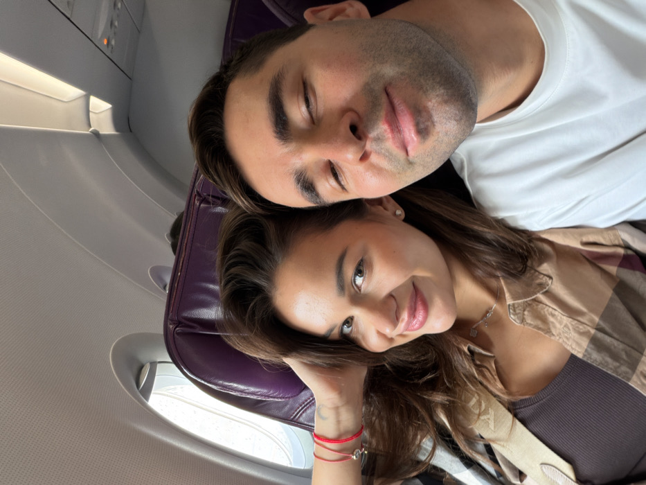 A man and a woman are closely situated within what appears to be an airplane setting. The man is in a white t-shirt with his eyes closed. The woman has long brown hair. She is wearing a light brown plaid shirt and a dark grey tank top. She has a red bracelet with a silver charm on her left wrist. The background contains a window with light coming through. The airplane seat is purple.