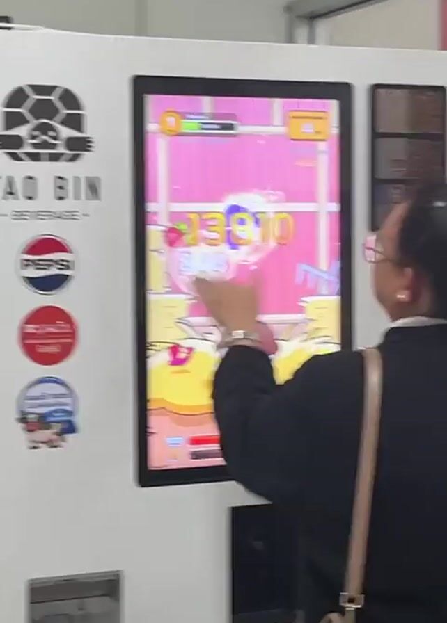 A woman wearing a black blazer, a light pink purse over her shoulder, and glasses is playing a game on a digital screen mounted on a large white beverage vending machine. The screen shows a pink cartoon game with a character resting on hay. The woman is tapping the screen repeatedly with both hands. The machine features a logo for TAO BIN beverage, a Pepsi logo, and other decals. In the background is a white wall and other details of what appears to be a commercial or institutional setting.