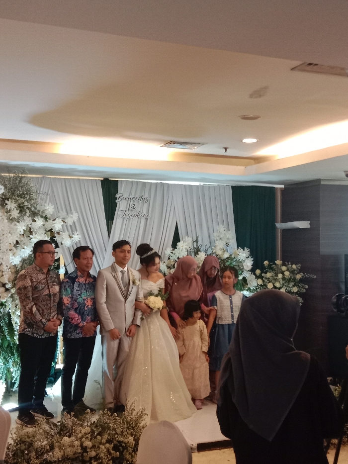 A group photo capturing a wedding celebration with the newlyweds at the center. The bride is in a glittering white gown and the groom in a grey suit. They stand in front of a backdrop of white drapes adorned with floral arrangements. Flanking them are family members or friends, including two women in hijabs and two men in batik shirts. A young girl in a dress and another young girl are also in the photo. Someone wearing a hijab stands in the foreground.