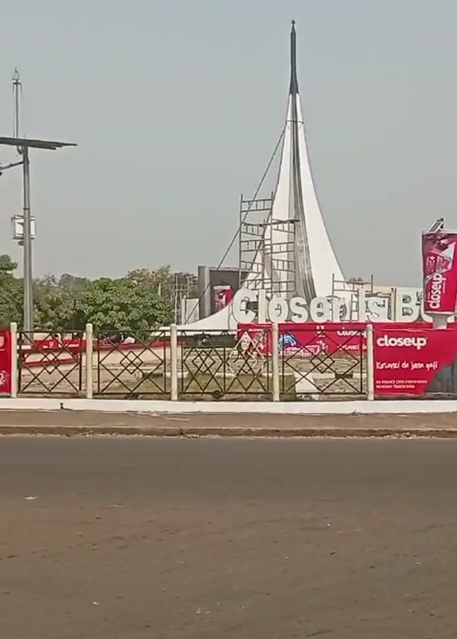 street scene in a city, possibly in Africa, judging by the vehicles and infrastructure. In the foreground is a roundabout with a modern, white, spire-like monument in the center, which appears to be decorated with red "Closeup" advertising banners. Various vehicles, including motorcycles, cars, an ambulance, and a three-wheeled vehicle known as a "tuk-tuk", are traveling on the road. A person wearing a yellow vest can be seen walking near the roundabout. The environment seems to be a mix of residential or commercial buildings and greenery, under a slightly hazy sky.