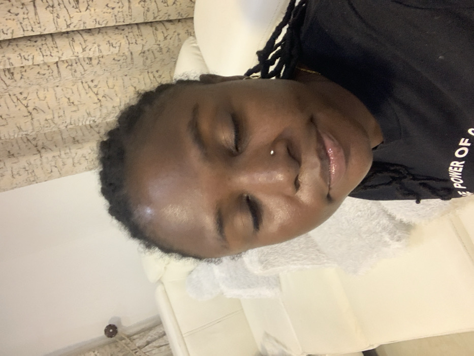 A woman with dark skin and braided hair lies on a white couch with her eyes closed, smiling slightly. She wears a black t-shirt with white text visible on the right side. A small silver nose ring is visible on her left nostril. A soft, white towel is positioned between her head and the couch. A textured wall covering is seen in the upper left corner of the image.