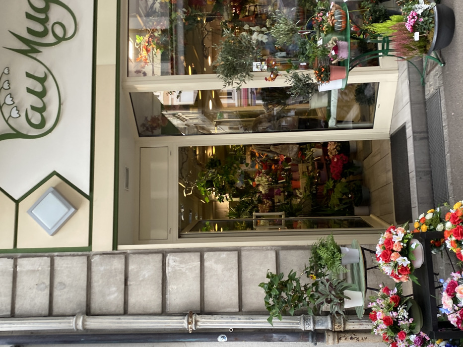 The image displays the exterior of "Au Muguet," a flower shop located in Évian-les-Bains, France