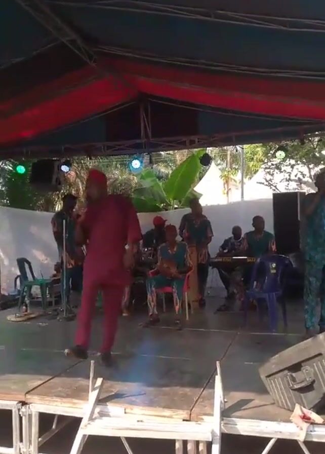 A band is playing on an outdoor stage. The stage is covered with a metal frame and has a blue and red tarp overhead. A man in a burgundy suit and matching hat is standing in front of a microphone, singing and dancing. Behind him, five other men are playing instruments: drums, keyboard, and stringed instruments that are being plucked. They are all wearing matching blue and orange patterned shirts. There are speakers and chairs on the stage. Behind the stage, there is a white cloth backdrop and trees. Some people are sitting or standing near the stage.