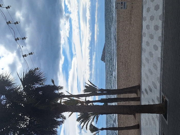 The image depicts a coastal scene in Benidorm, Spain. In the immediate foreground, a dark-colored paved surface transitions to a lighter-toned promenade with a repeating hexagonal pattern in gray and off-white. Multiple palm trees are positioned along this promenade and the adjacent sandy beach; a large palm tree dominates the left foreground, its canopy extending beyond the frame. Behind the promenade and palm trees lies a wide expanse of light brown sand, forming the beach. Further beyond, the Mediterranean Sea exhibits light waves. On the horizon, a distinct rocky island, identified as Benidorm Island, is visible. The sky above is partly cloudy, featuring patches of blue sky interspersed with varying densities of white and darker gray clouds. A string of decorative outdoor lights, each with a clear bulb, stretches diagonally across the upper portion of the frame, suspended against the sky. A white vertical signpost with black text and symbols stands on the sand to the right. No individuals, animals, or vehicles are present in the scene.