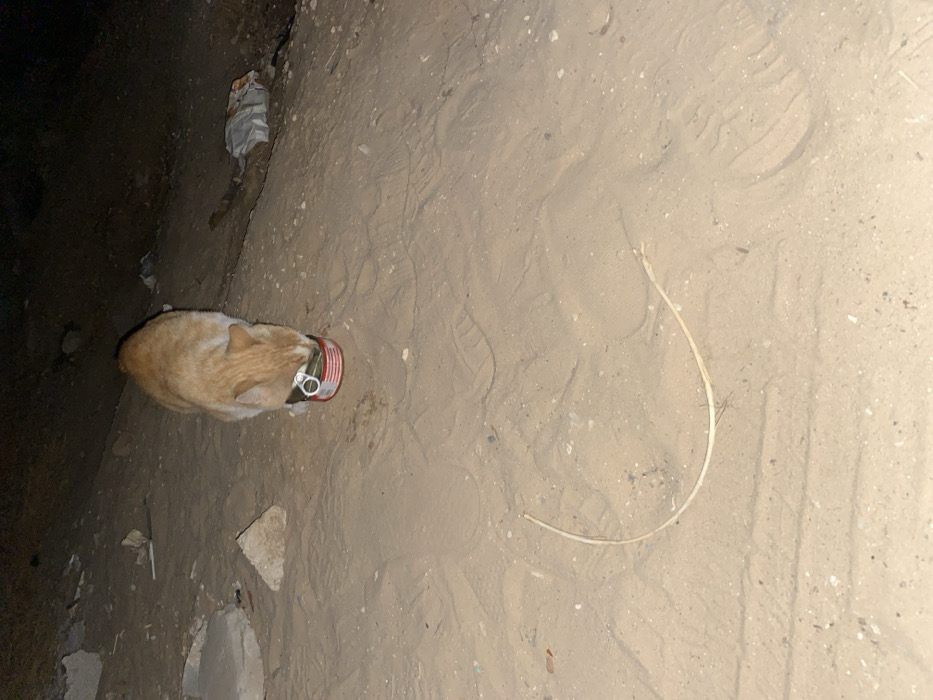 An orange tabby cat is observed from a slightly elevated rear angle, actively feeding with its head submerged into a metal can. The can features a red band and a visible silver ring-pull mechanism. The scene is set outdoors on sandy, light-brown ground, exhibiting multiple footwear impressions. To the immediate left of the cat, two fragments of light-colored concrete rubble are present. In the darker background on the right, debris, possibly consisting of light-colored plastic or paper, is scattered on a subtle incline. A thin, light-colored, curved plant stem or stick lies in the foreground on the sand. The overall illumination is dim, consistent with nighttime conditions. The location is the city of Khan Yunis, Palestinian Territory.
