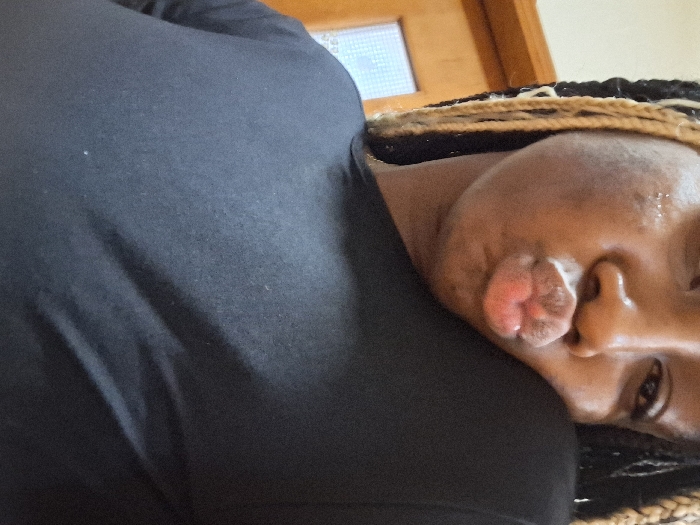A woman with braided hair, some strands blonde, leans her face toward the camera. Her lips are puckered in a kissy face. She wears a black top that covers much of the frame's left side. A light brown wooden door with a frosted glass pane is slightly visible in the background. The shot is close-up, tilted, and focuses on the subject's face and upper torso.