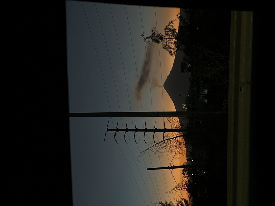 A nighttime landscape is framed by a dark window. Silhouetted power lines stretch across the view, with a pointed mountain visible in the distance. The sky transitions from a deep blue to a pale orange hue near the horizon. Trees, also silhouetted, are scattered along the lower part of the frame, adding to the sense of depth. A faint cloud or plume hangs near the mountain peak.