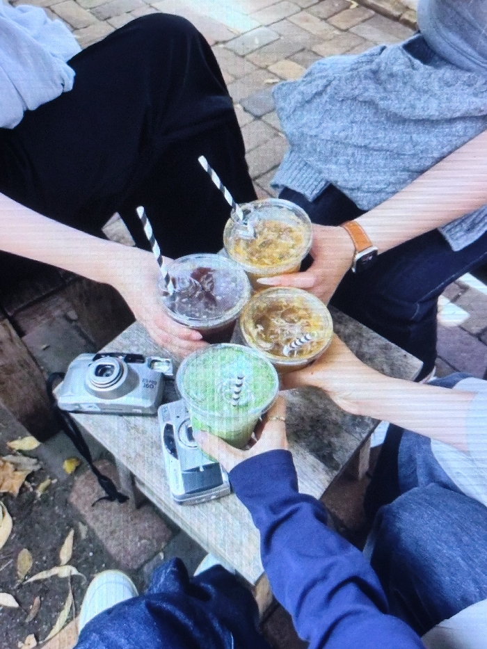 Four individuals are observed from an overhead perspective, engaging in a toast or celebratory clink of beverages. The scene is set outdoors, likely on a patio in Charleroi, Belgium, indicated by brick paving and scattered dry leaves on the ground. A wooden table or bench serves as a surface. Each person holds a clear plastic cup with a domed lid and a black-and-white striped paper straw. The beverages vary: one is dark reddish-brown, two are amber/light brown (consistent with iced coffee or tea), and one is light green (consistent with matcha or a green smoothie). Visible attire includes black pants and a light top on the upper-left individual, a grey cable-knit sweater and dark blue jeans on the upper-right individual (who also wears a brown leather-strapped watch), dark blue pants and a dark blue long-sleeved shirt on the lower-left individual, and light blue jeans with a light top on the lower-right individual. One hand displays a thin metallic ring. Two compact silver film cameras are positioned on the wooden surface. One camera, labeled "Zippo 160," is fully visible with a black strap. The second camera is partially obscured.