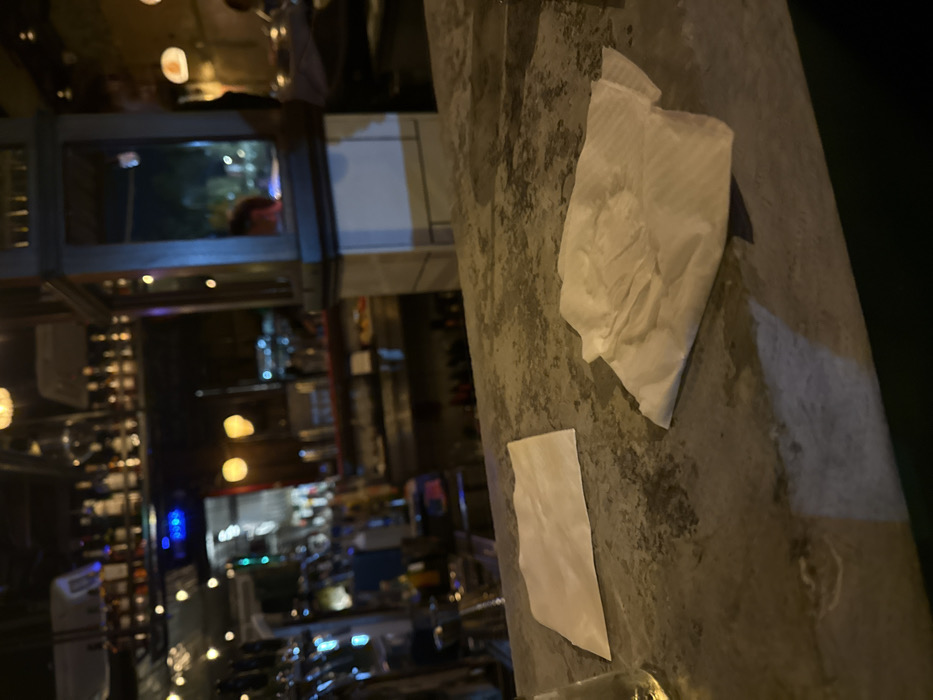 A blurry image captures the interior of a bar or restaurant at night. Soft, warm lighting emanates from the scene, showcasing rows of wine bottles and dimly lit tables. In the foreground, a textured, possibly concrete pillar is marred with two used, wrinkled white paper napkins stuck to its surface. The pillar and the napkins are in sharp contrast to the luminous, out-of-focus backdrop of the bar.