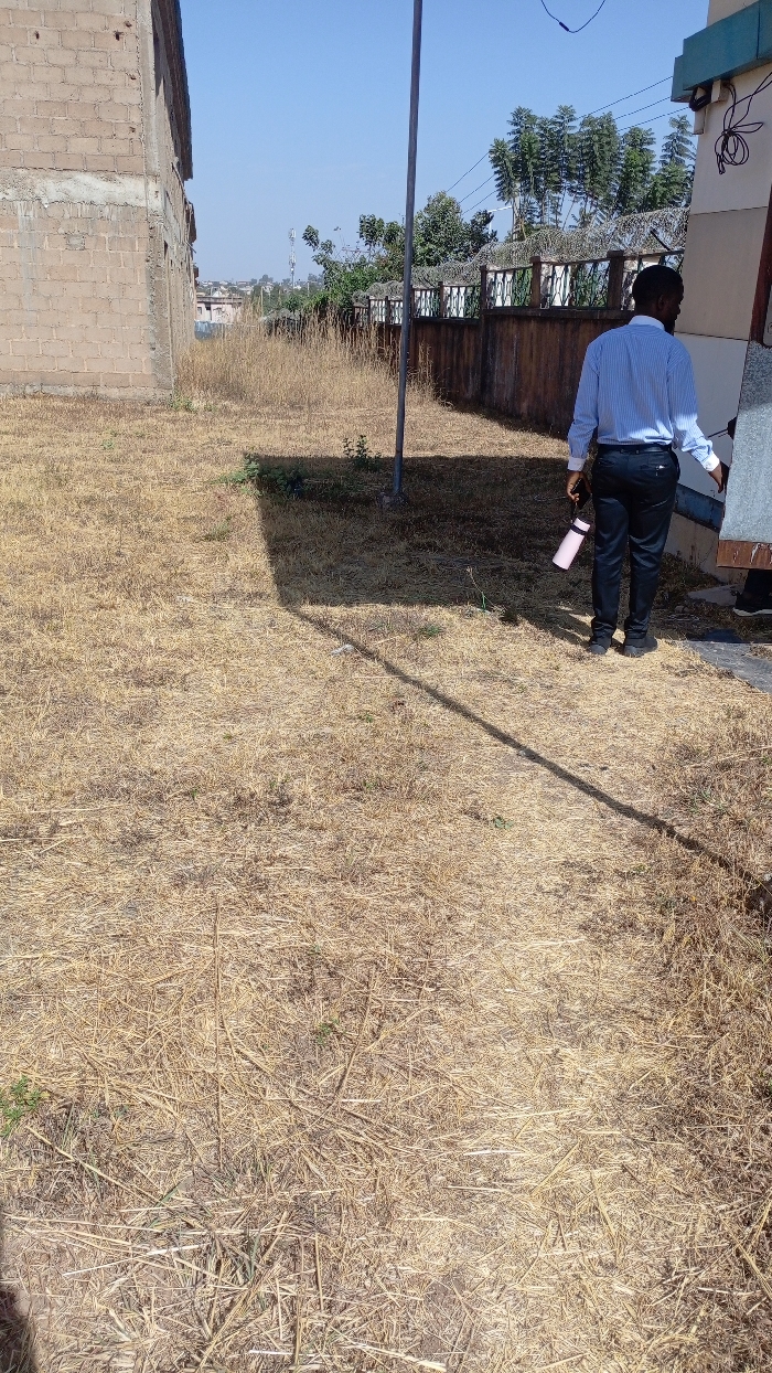 This image captures an outdoor scene in Jos, Nigeria, under bright daylight with a clear blue sky and distinct shadows. The foreground and midground are dominated by dry, light-brown grass and straw, with sparse green weeds. A long, thin shadow, likely from the visible pole, extends diagonally across the ground. An adult male, viewed from behind, walks towards the right side of the frame. He wears a light blue and white striped long-sleeved shirt, dark trousers, and dark shoes. He holds a light pink cylindrical bottle in his left hand, hanging by his side. To his immediate right is a section of a building facade featuring light-colored and dark grey panels or tiling. A thin, grey metallic pole stands vertically in the midground, extending from the lower mid-ground upwards. To the left, a multi-story building constructed of bare concrete blocks (cinder blocks) is partially visible, appearing to be incomplete or under construction. The background features a brown perimeter wall, topped with white decorative elements and razor wire, running horizontally. Behind this wall are several trees with green foliage. The distant background reveals more urban structures and visible telecommunication towers under the clear sky.