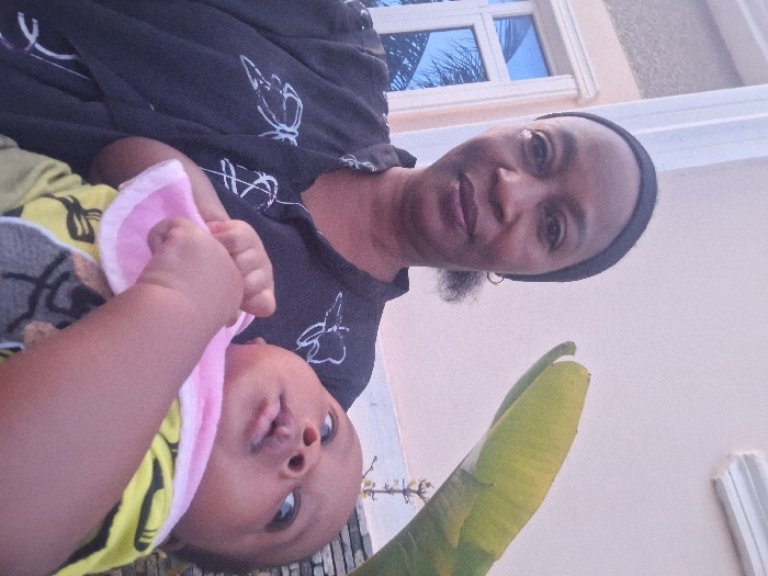 An adult female is depicted holding an infant outdoors in the city of Barden Yana, Nigeria. The female, positioned on the left, has dark skin, dark curly hair, and wears a black headband, small hoop earrings, and a dark shirt with light-colored patterns. She maintains a neutral expression, looking directly at the camera. She holds an infant with dark skin, clad in a yellow and black patterned top and a pink and white bib. The infant's hands are clasped at its chest, and its gaze is directed upwards and to the right of the frame, away from the camera. The background consists of a light-colored building wall with white architectural trim, including a window on the left reflecting blue sky and foliage. A large, green, broad leaf is visible in the upper right, with additional plant life partially obscured below it. The scene is illuminated by natural light.