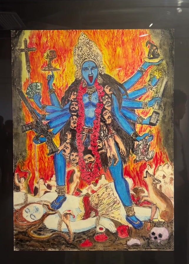 A video shows a framed painting. The painting features an interpretation of the Hindu goddess Kali, depicted with blue skin, multiple arms, and a necklace of human heads. The goddess is standing amidst a fiery backdrop, trampling over what appears to be prostrate bodies. The goddess holds various symbolic items in her hands, including money, a cross, a chalice, and what looks like an oil rig. A rifle is also present, held in one of the goddess's arms. A dog and a skull are visible at the bottom right of the painting. The camera zooms in to focus on the goddess's face, her chest, and the garland of heads she wears. The painting is on display at an art gallery.