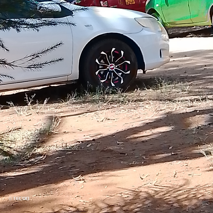 The image displays the front left quarter of a white sedan, featuring a black, branch-like decal along its visible side. The front wheel is equipped with a black tire and a decorative wheel cover with a multi-spoked design in red, white, and black. The vehicle is positioned on an uneven dirt surface sparsely covered with dry grass. Long, dark shadows extend across the foreground from left to right. In the background, the rear section of a red vehicle with a partially visible license plate "KDC 624P" is present, behind which a portion of a green vehicle can also be seen. No people are visible. This scene is located in Machakos Central ward, Kenya.