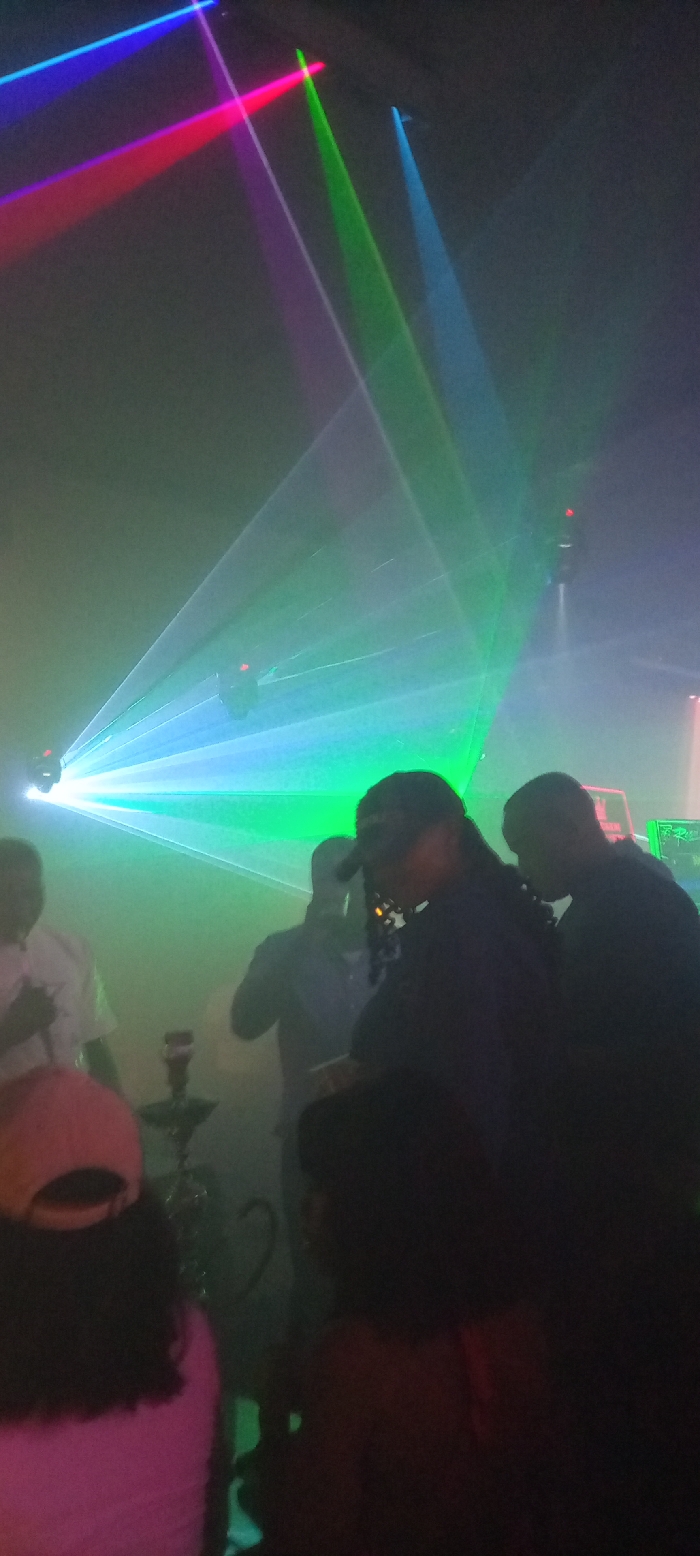 Inside a dimly lit, hazy space, colorful laser beams crisscross the ceiling. Several people are congregated, their features obscured by the low light. A hookah stands prominently in the foreground. The atmosphere suggests a nightclub or a social gathering with ambient lighting and entertainment.