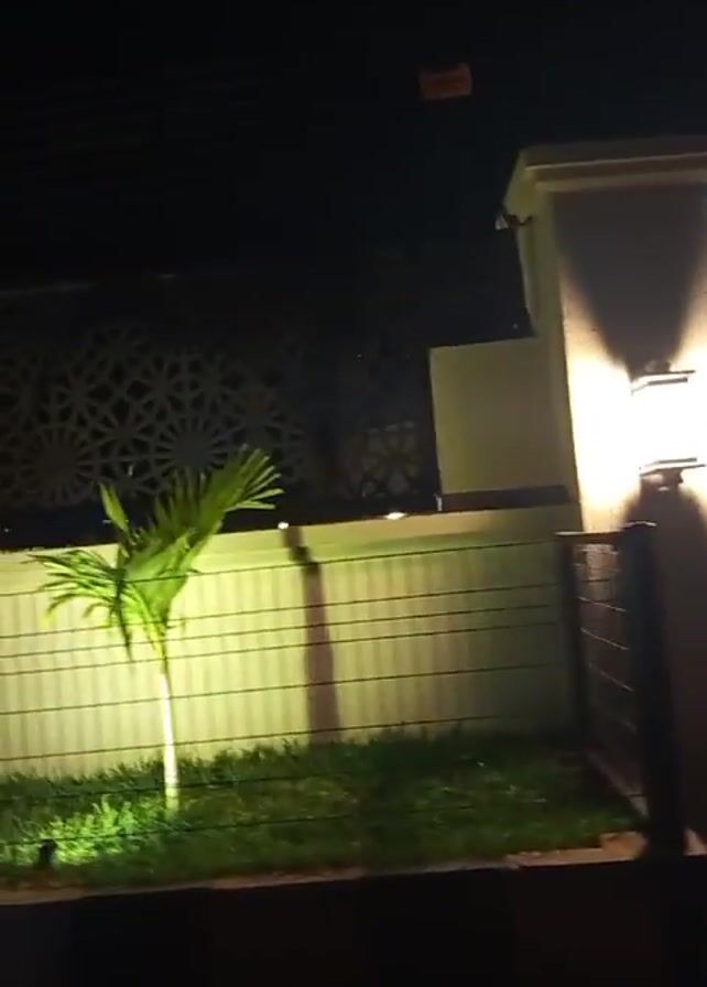 nighttime view from what appears to be a moving vehicle, focusing on a building's exterior. The building is surrounded by a fence, a small strip of grass, and short palm trees. The lighting on the building highlights architectural details. The fence is made of metal, and the building itself appears to be well-lit with multiple light fixtures. The camera movement makes it difficult to discern exact details, but the scene is clearly focused on the building's exterior aesthetics.