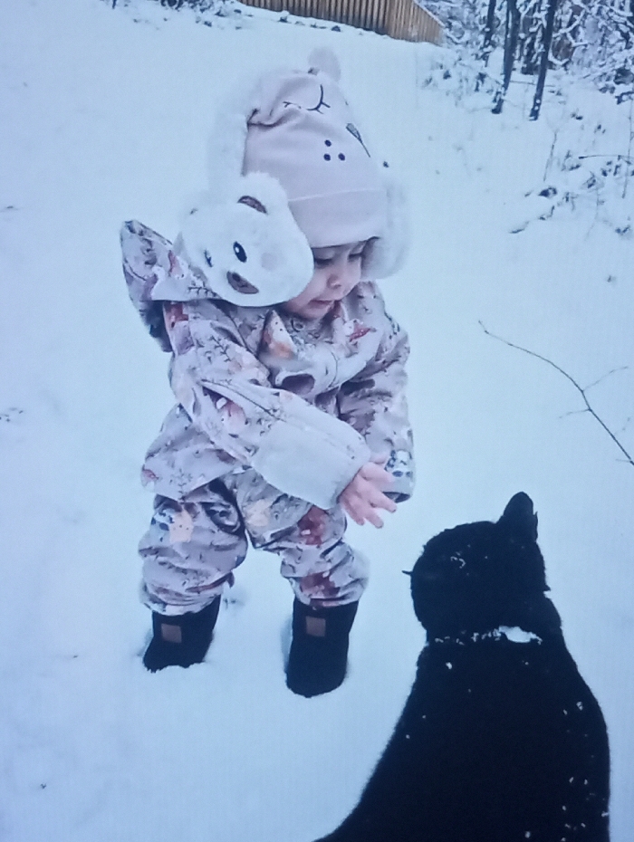 The image depicts a snowy outdoor scene in Riga, Latvia. A young child, dressed in a patterned snowsuit, a light pink hat with ear flaps and a bear motif, and black boots, stands upright in the snow. The child's hands are extended forward, appearing to reach towards a black cat positioned in the foreground. The cat, with flecks of snow on its fur, is looking upwards at the child. The ground is entirely covered in snow. In the background, snow-covered bare trees or brush are visible, with a wooden fence-like structure partially discernible in the upper left.