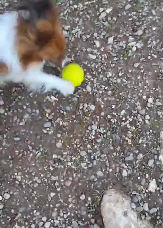 - "A dog with brown, white, and black fur, picks up a yellow tennis ball from a gravelly patch of ground" by FM-ngoIJ3, licensed under CC BY 4.0