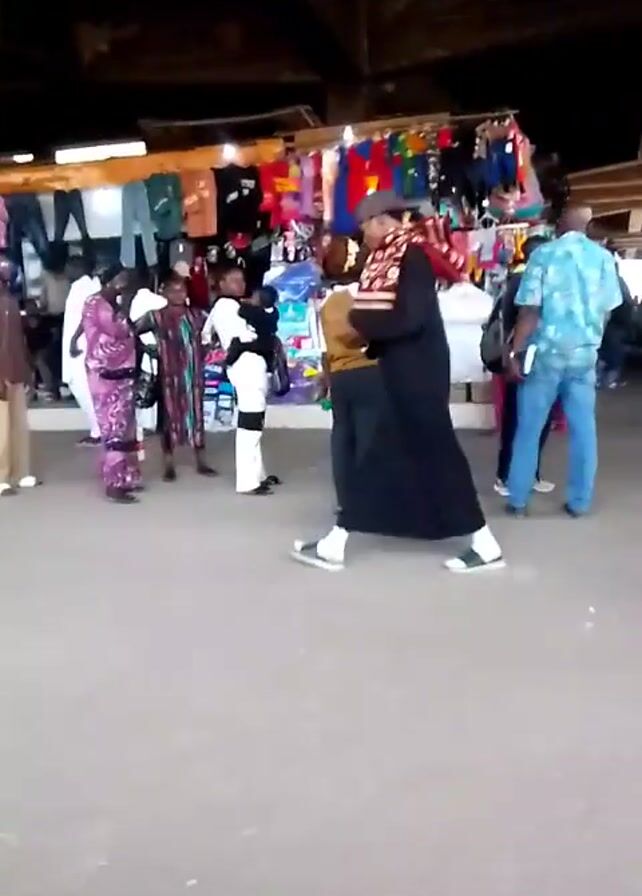 The video depicts a crowded outdoor market area beneath a bridge or overpass. People are milling around, browsing through stalls displaying various items, primarily clothing. The clothing is diverse, including colorful shirts, pants, and traditional robes. The ground is concrete, and the lighting is somewhat dim due to the overhead structure. Some individuals are standing in groups, possibly conversing or negotiating purchases. A person wearing a black robe and a patterned head covering walks across the frame from left to right.