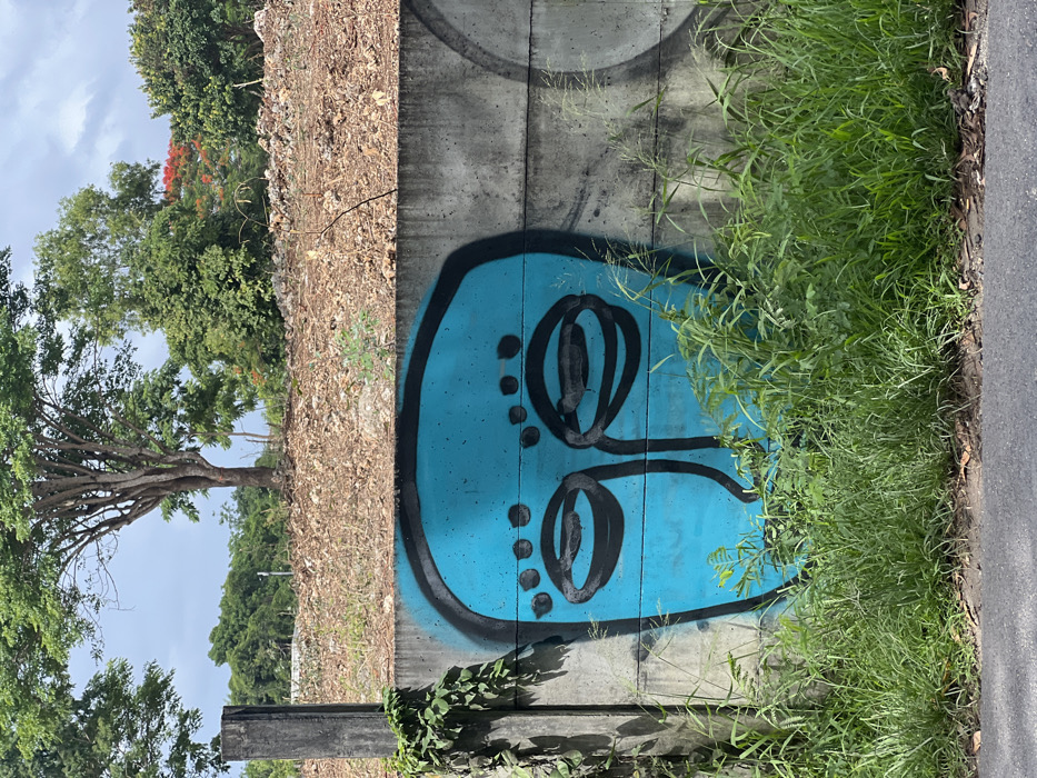 A concrete wall displays a stylized blue face with black outlines and features. The face has two large, oval eyes, each with smaller circles inside, and a series of small dots below. A continuous line connects the eyes, suggesting a nose or cheek. The wall is bordered by green grass and vegetation on the right and bare dirt with some trees on the left. A concrete post with climbing vines is visible at the bottom left.