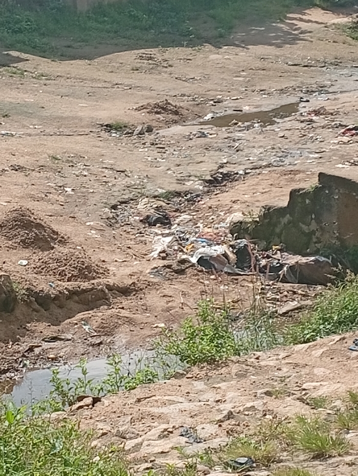The image displays an unpaved, eroded dirt area within the city of Madalla, Nigeria, characterized by uneven ground, ruts, and small mounds of soil