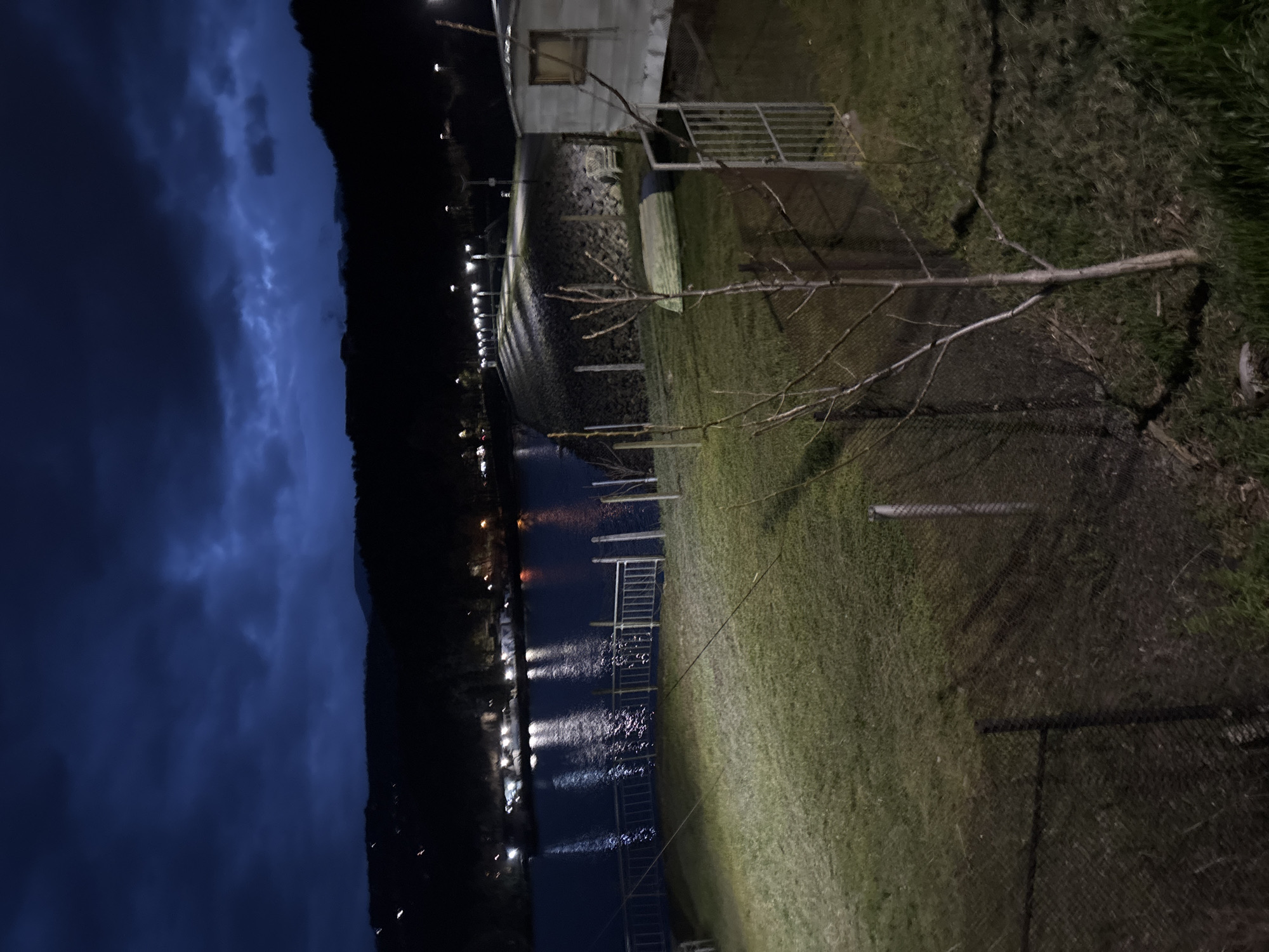 The image depicts a nighttime scene, possibly in or near German, Bulgaria, though the exact location is not discernible from the image alone. The left side shows a dark mountain silhouette against a cloudy, indigo-colored sky. Below the mountain, a body of water reflects scattered lights, potentially from buildings or street lamps lining its shore. Several docks or piers extend into the water. On the right side of the image, there is a grassy area with sparse vegetation. A bare tree branch is visible in the foreground, and a building with a metal railing stands at the edge of the grassy area. A chain-link fence runs along the ground. The overall scene suggests a lakeside or riverside location at night, with the dark mountain providing a prominent backdrop. There is no indication of people or animals in this image.