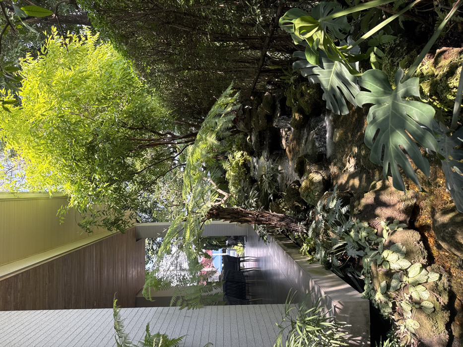 The scene depicts a covered outdoor patio bordering a lush garden and water feature in Nong Pa Khrang, Thailand. On the left, a light-colored, textured building wall supports a wood-paneled patio ceiling and a dark-tiled floor. Dark outdoor chairs and tables are arranged on the patio in the background. A man-made stream, featuring multiple small cascades over moss-covered rocks, flows from the background towards the foreground. The stream is flanked by dense tropical vegetation, including large tree ferns, a prominent large-leafed plant resembling Monstera in the immediate foreground, and various green shrubs and ground covers. A large tree with bright green foliage stands in the upper right, with dense foliage forming a natural screen on the far right. Strong sunlight illuminates the upper foliage and portions of the stream, casting distinct shadows. No individuals are present.