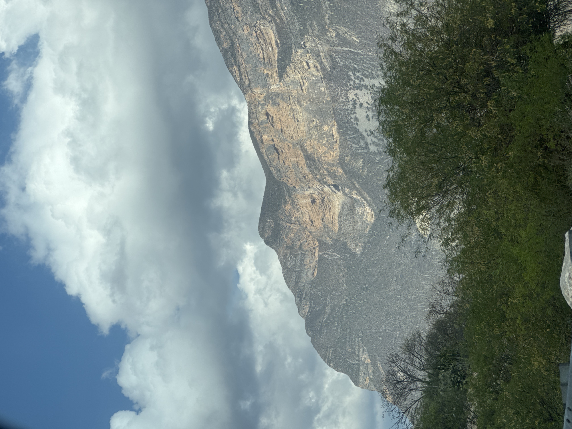 mountainside in Cerro Verde, Mexico. The mountain is rocky and steep, with exposed rock faces and sparse vegetation. The sky is filled with clouds, and there are trees in the foreground.