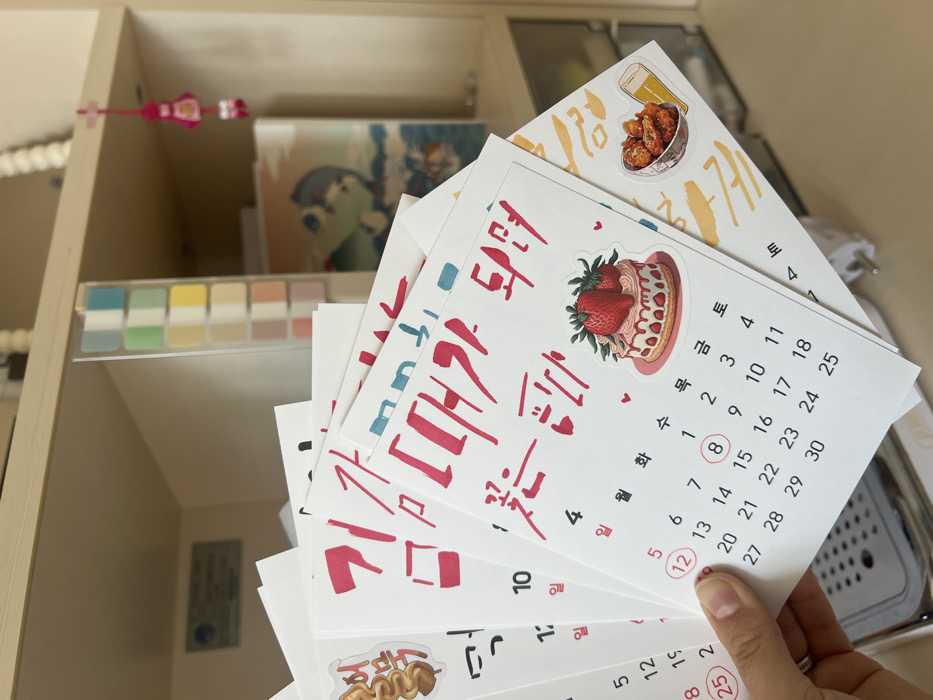 A close-up image shows a left hand holding a fanned stack of at least six personalized calendar cards, presented against a blurred background of an indoor shelf unit