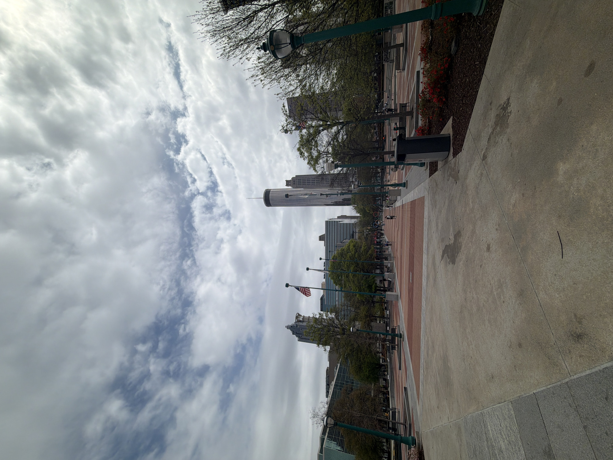 The image depicts a pedestrian walkway with a view of the Atlanta skyline in the United States of America. The pathway is constructed of concrete and brick, lined with street lamps, benches, trees, and flower beds. An American flag is visible amongst the buildings. The sky is cloudy. Several skyscrapers are visible including the Westin Peachtree Plaza Hotel which has a distinctive cylindrical shape. The environment is urban and suggests a public space.
