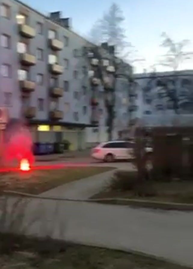 red flare burning in a grassy area in front of an apartment building. The building is several stories tall with balconies. A white car is parked nearby. A person in a black hooded jacket enters the frame and looks at the camera, smiling briefly. The camera then pans back to the burning flare.