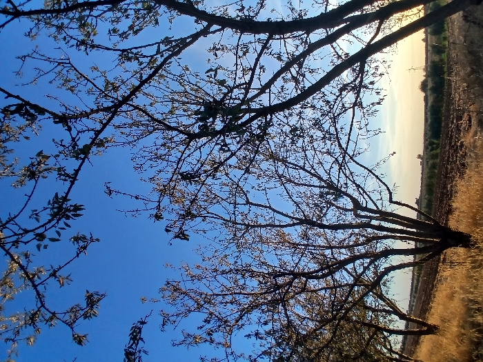 This image displays an agricultural landscape in Oued Jdida, Morocco, observed from a low vantage point looking towards the horizon. The upper two-thirds of the frame consist of a clear sky, transitioning from a deep blue overhead to a lighter blue, yellow, and orange gradient near the horizon, indicating either sunrise or sunset. Several deciduous trees with dark, largely bare or sparsely leafed branches are silhouetted in the foreground and midground, their intricate branch structures prominent against the bright sky. The immediate ground surface is covered in dry, golden-brown grasses, illuminated by a warm, low-angle light. Beyond this, a section of dark, tilled earth is visible, indicative of cultivated land. Further in the distance, a horizontal band of green vegetation, possibly an orchard or planted field, stretches across the scene. The distant horizon reveals several dark, indistinct structures, including buildings of a settlement and an electrical transmission pylon. No human figures or animals are present, and no overt actions or interactions are depicted.