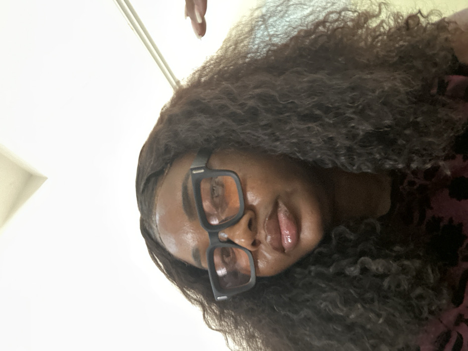 The image displays a close-up, upward-angled portrait of a single individual, an adult female with dark skin and long, dark, curly hair. She wears large, dark-framed, rectangular eyeglasses with orange-tinted lenses. Her lips are glossy, and she is wearing a dark garment with an indistinct pattern. Her gaze is directed towards the camera. In the upper right corner, a portion of a hand with light-colored, manicured fingernails is visible. The background consists of a plain, light-colored wall or ceiling, indicating an indoor environment. A subtle diagonal line is discernible in the upper right background. There are no specific visual identifiers or landmarks within the frame to determine a precise location within the city of Abuja, Nigeria.
