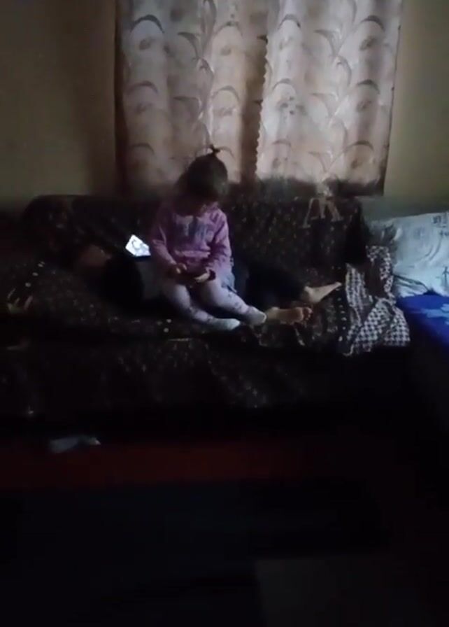 The scene is a dimly lit room featuring a young girl sitting on a patterned sofa