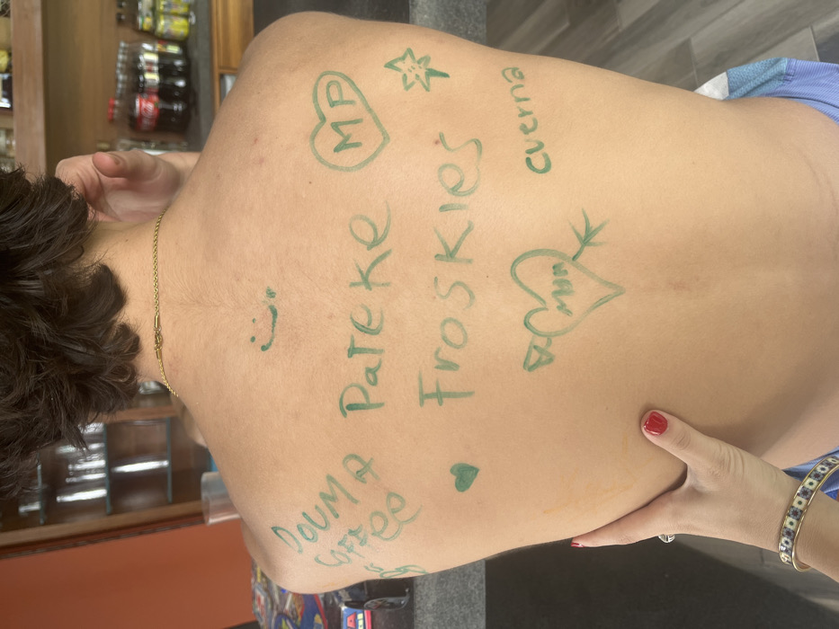 A person's bare back displays writing and drawings in green marker. "Douma Coffee," "Pateke," and "Froskies" are written vertically. There's a heart with "MP" inside, a star, "Cuerna," and another heart with wings and an arrow through it, labeled "Mum." A smiley face and small heart are also present. Someone's hand with red nail polish rests on the lower right side of the back, wearing a bracelet. A gold chain is visible around the neck.