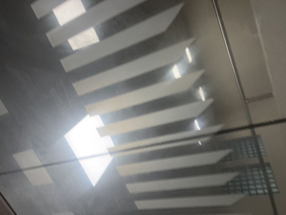 The image depicts an upward-angled view of a modern indoor architectural space located in Alasia, Nigeria. The scene is static, with no individuals present or actions taking place. The upper portion of the frame is dominated by a structured ceiling or roof system. A large, brightly illuminated square light source is centrally positioned, appearing against a dark gray background that exhibits a fine, consistent horizontal line pattern, suggesting a screen or textured transparent material. A series of approximately twelve light-colored, opaque, vertical panels, with a trapezoidal or rectangular cross-section, are suspended from this ceiling. These panels are uniformly spaced and arranged diagonally across the frame, from the upper left to the lower right. Below these suspended panels, the upper part of an interior room or atrium is discernible. On the lower left, a dark, rectangular area with a distinct grid pattern is visible, potentially a window with bars, a vent, or a decorative screen. Extending horizontally across the lower-mid section of the frame is a metal railing or handrail. Beneath the railing, a light-toned, unadorned wall or structural surface is present. Multiple smaller, horizontal strip lights are visible as reflections or fixtures embedded within the ceiling structure, positioned between the suspended panels. A thin, dark vertical line, possibly a structural element or a mark on the viewing medium, runs down the center of the image.