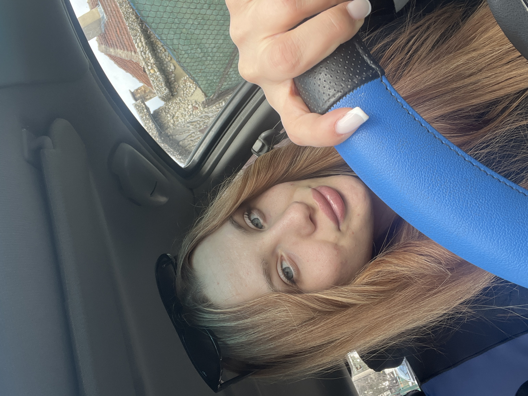 The image depicts a close-up selfie taken from the driver's seat of a vehicle in Sofia, Bulgaria. A female subject, with fair complexion, light-colored eyes, and long, light brown hair, is centered in the frame, looking directly at the camera. Black sunglasses are positioned on her head. Her right hand, exhibiting manicured nails with white French tips, is gripping a steering wheel covered by a two-tone blue and black padded accessory. The vehicle's interior headliner and sun visor, both gray, are visible in the upper portion of the frame. Through the passenger-side window, a partial view of the exterior reveals a residential building featuring a red tiled roof, a facade adorned with light-colored pebbles, and two visible chimneys. A green diamond-patterned mesh fence is visible in the immediate exterior foreground. In the distant background, bare deciduous trees and a portion of a light-colored vehicle are discernible. The scene is lit by diffused daylight.