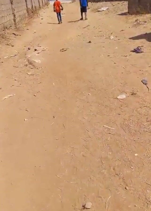 two figures walking away from the camera on a dirt road. The figure in the foreground appears to be a child wearing an orange shirt, while the second figure is an adult in a blue shirt. They are walking on a dirt path, bordered by low brick walls on one side and the foundations of unfinished buildings on the other. The ground is dry and littered with debris. The weather appears sunny and bright.