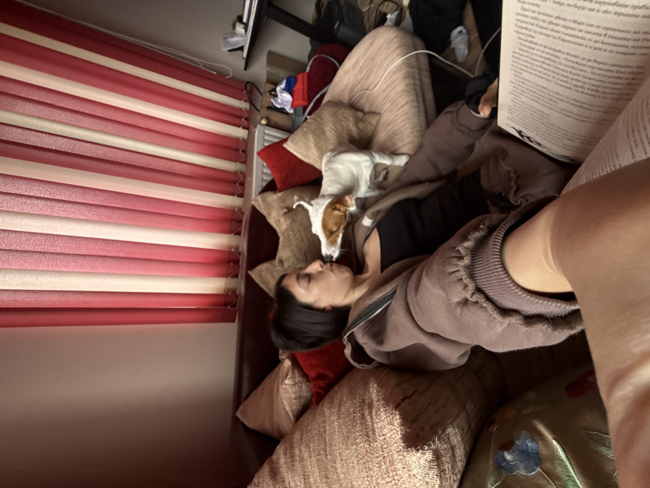 An indoor scene in Galabovtsi, Bulgaria, depicts a female individual and a dog interacting on a couch. The female, with dark hair, is reclined on a dark-colored couch, positioned on her left side. She wears a dark tank top and a brown hooded zip-up jacket. Her eyes are closed or nearly closed, and her lips are slightly puckered. Her right arm is extended towards the viewer, suggesting she is holding the camera. Her left hand appears to be holding an open book, partially visible in the lower right foreground. Adjacent to her, a small white dog with brown patches, consistent with a terrier breed, stands on the couch. Its snout is in direct contact with the female's puckered lips, indicating an affectionate interaction. The couch is upholstered in a dark material, likely leather or faux leather, and adorned with multiple pillows, including a large textured brown pillow in the foreground, solid red pillows, and patterned brown/beige pillows. In the background, a window is fitted with vertical blinds featuring alternating red and light beige stripes. A white radiator is visible below the blinds. To the far right, a partial view of a cluttered area with what appears to be a desk or table and various objects is discernible. A white cable runs across the right section of the couch. The room is brightly lit, likely by natural light.