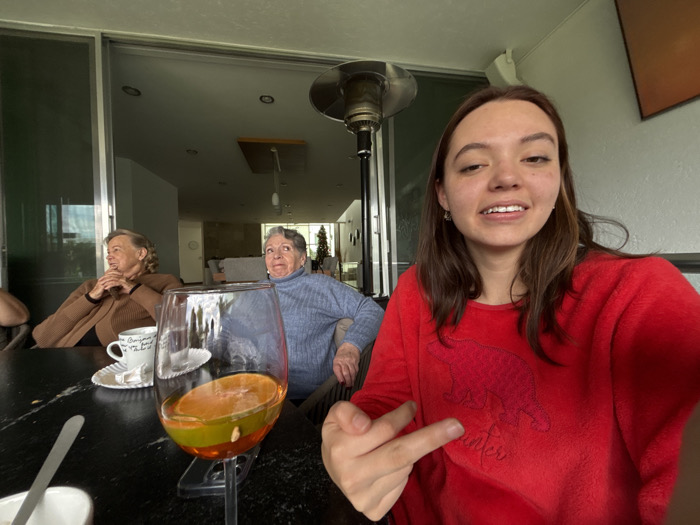 Three women sit around a dark table, one prominently holding her middle finger up. A glass containing an orange slice and liquid is in the foreground. Two other women are visible in the background, one with a cup and saucer in front of her. A tall patio heater stands behind the table. The indoor space has large glass doors and a glimpse into another room with Christmas decor. The woman nearest the camera wears a red sweater.