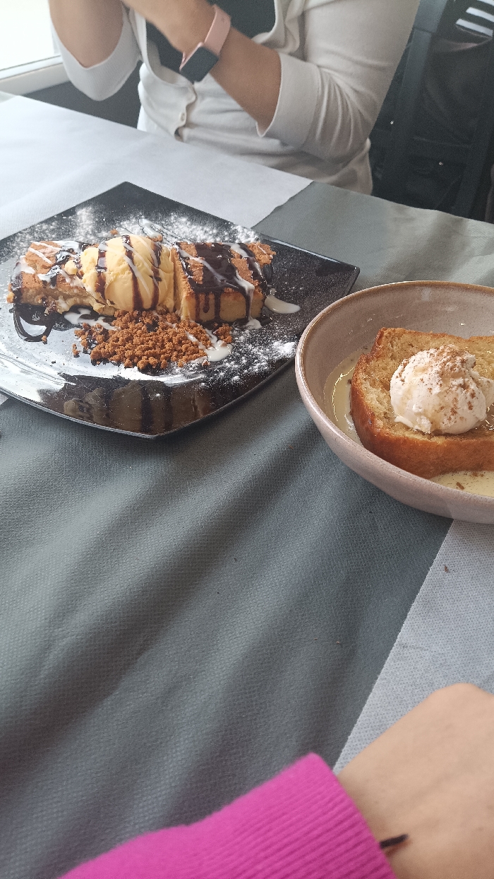 The image depicts an indoor dining scene in Sagunto, Spain, focused on two dessert plates positioned on a table. In the upper background, the upper torso and arms of an individual are visible, dressed in a white long-sleeved cardigan over a dark top. A light pink smartwatch is present on their left wrist. In the lower right foreground, a hand and wrist, clad in a bright pink long-sleeved garment, are partially visible. The table is covered with a dark grey tablecloth featuring a lighter grey section. A white paper placemat underlies the primary dessert plate. On the left, a rectangular black plate presents a dessert composed of multiple slices, possibly French toast or cake, topped with three scoops of yellow ice cream, drizzled dark chocolate sauce, and scattered brown cookie crumble. White powdered sugar dusts the plate surface. To the right, a round, beige ceramic bowl contains a slice of bread-based dessert, partially submerged in a white creamy sauce, and topped with a scoop of white ice cream or whipped cream dusted with a light brown powder. A brightly lit window is visible in the distant left background.