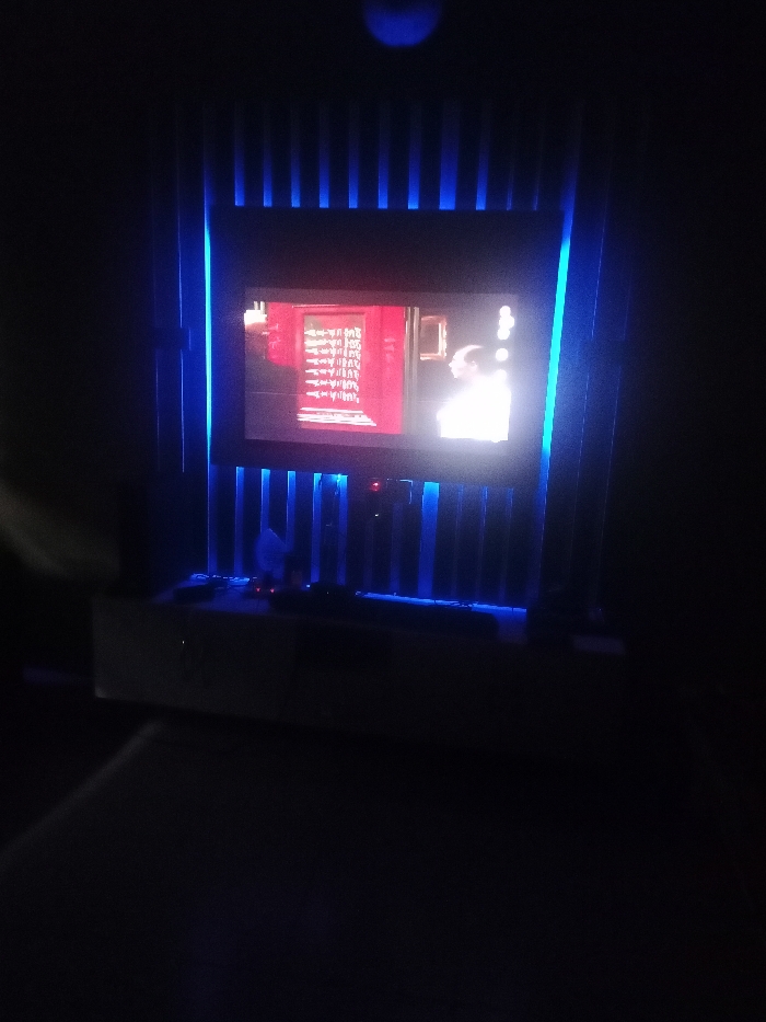 This image depicts a dimly lit indoor environment, likely a recreational area, in the city of Unknown, Unknown. A large, flat-screen television is centrally positioned within a wall unit or entertainment structure. The television displays content featuring a red background with white vertical text or symbols on the left side, and a brightly illuminated, indistinct figure on the right. The surrounding wall unit is accented by multiple vertical strips of blue LED lighting, positioned above, below, and to the sides of the television screen. Below the television, a dark entertainment console or stand is visible, upon which several dark objects, possibly electronic devices, and a faint, light-colored object on the left, are placed. The room itself is dark, and no individuals are visible.