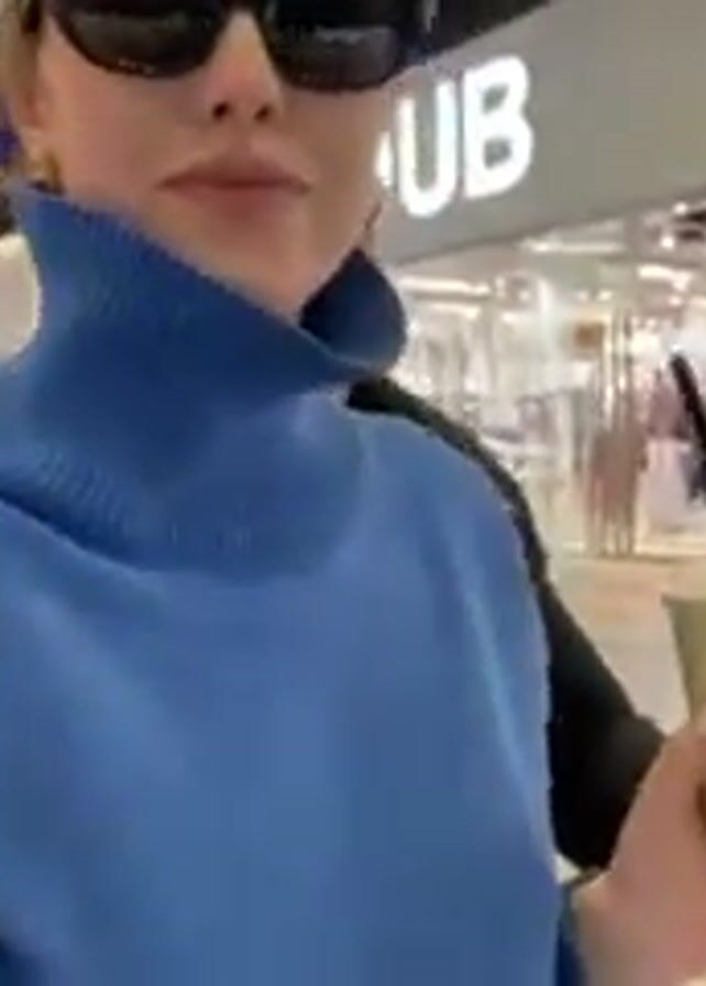 A woman in a blue turtleneck sweater and sunglasses is walking through a mall and holding two cups of coffee. A man walks behind her, and other shoppers are visible in the background. The mall has a variety of stores and bright lighting. The woman is facing the camera as she walks, and the camera is moving with her. The man appears to be talking but it’s unclear what he is saying.