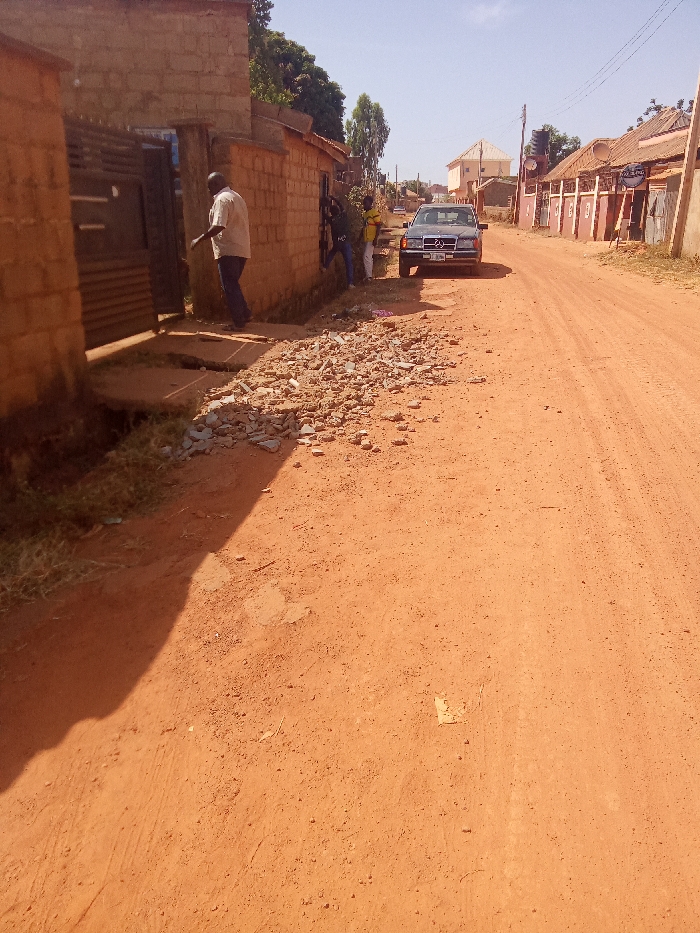An unpaved, reddish-brown dirt road traverses a residential area in Jos, Nigeria, under a clear, bright blue sky with direct sunlight casting strong shadows. On the left, a building constructed of unpainted concrete blocks features a dark metal gate, which is partially ajar. A man in a light-colored short-sleeved shirt and dark trousers is depicted in motion, stepping towards the gateway. Adjacent to the building's wall and extending onto the roadside is a significant accumulation of broken concrete fragments and rubble. Two additional individuals are visible further along the same wall; one wears a dark top, and the other a yellow top, both appearing to stand near the wall closer to the midground. A dark-colored Mercedes-Benz sedan is parked on the right side of the road, facing the camera. The road continues into the distance, flanked by similar residential structures with reddish roofs and perimeter walls. Sparse vegetation is present in the immediate foreground and background.