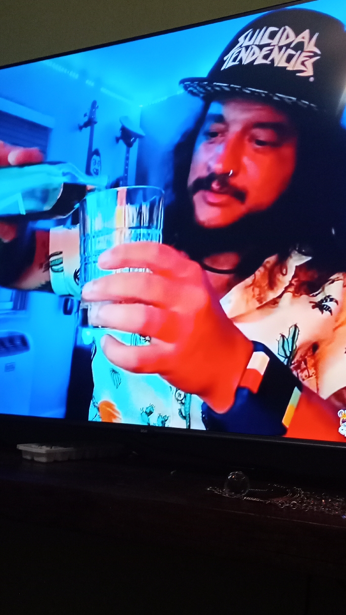 A man with long dark hair, a mustache, and a nose ring wears a "Suicidal Tendencies" hat and a patterned shirt with cacti. He pours liquid from a bottle into a glass. The background is illuminated with blue light, and two guitars hang on the wall. The scene appears to be a shot from a television screen. A remote sits on a dark-colored surface below the TV.