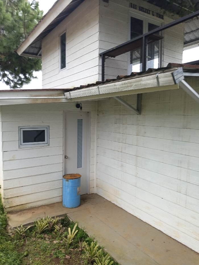 The image displays an exterior view of a two-story building section in Man Gyat, Myanmar, characterized by white horizontal siding that exhibits vertical streaks of discoloration and weathering